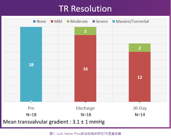 圍術(shù)期無院內(nèi)死亡事件發(fā)生,腦血管事件、心梗和再次手術(shù)干預(yù)發(fā)生率均為0%。僅一例患者在術(shù)后10天因房顫植入永久起搏器,其他患者均無并發(fā)癥發(fā)生。術(shù)后30天隨訪結(jié)果顯示,患者TR嚴(yán)重程度和NYHA心功能分級(jí)顯著改善(圖1、圖2)。全因死亡率為5.6%(與器械無關(guān)),心血管死亡、腦血管事件、心梗和再次手術(shù)干預(yù)發(fā)生率均為0%。手術(shù)成功率為100%,無患者轉(zhuǎn)外科開胸。在會(huì)議期間,Anson Cheung教授還展示了一個(gè)簡(jiǎn)短的手術(shù)視頻(見手術(shù)短視頻),分布拆解了LuX-Valve Plus經(jīng)血管(頸靜脈)三尖瓣置換的手術(shù)要點(diǎn),并強(qiáng)調(diào)了LuX-Valve Plus給術(shù)者帶來的手術(shù)體驗(yàn)感好、容錯(cuò)率高,得到了現(xiàn)場(chǎng)醫(yī)生同道的一致好評(píng)。