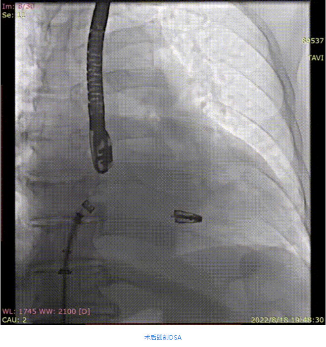 手術(shù)采用全身麻醉插管,經(jīng)股靜脈-房間隔入路,在TEE和DSA引導(dǎo)下完成房間隔穿刺。置入瓣膜夾系統(tǒng)后,在左房調(diào)整瓣膜夾的位置和軸向,后進(jìn)入左室,在TEE引導(dǎo)下捕捉二尖瓣前后瓣葉,并關(guān)閉瓣膜夾。經(jīng)TEE反復(fù)確認(rèn)手術(shù)效果后最終鎖定并釋放瓣膜夾。術(shù)后即刻超聲顯示瓣膜夾位置穩(wěn)定,功能良好,肺靜脈逆流和左房壓都明顯好轉(zhuǎn)。