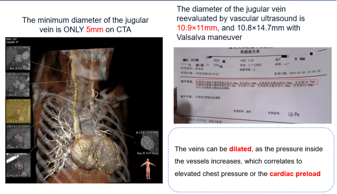 在早期篩選的病人中,有部分病人的頸內(nèi)靜脈最小直徑小于8.5mm,導致無法接受Lux-Valve Plus治療。然而在之后的臨床實踐中,術(shù)者們發(fā)現(xiàn)通過增加胸腔壓力或心臟前負荷,頸內(nèi)靜脈可以被擴張。如下圖中的病例,術(shù)前的頸部CT顯示頸內(nèi)靜脈最小徑僅為5mm,然而乏式動作(Valsalva maneuver)后血管內(nèi)超聲測得的內(nèi)徑為11mm。這樣的病例提示不能僅僅依靠術(shù)前的頸部CTA來作為唯一的血管入路排除標準,通過一些術(shù)前準備,頸內(nèi)靜脈的內(nèi)徑可以被擴張,而血管內(nèi)超聲可以監(jiān)測這一變化。