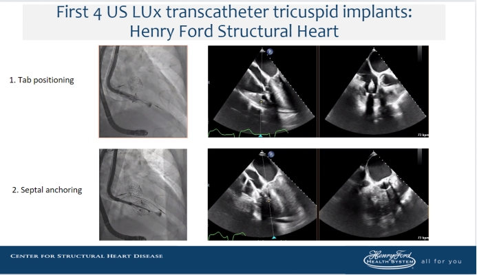 Dee Dee Wang教授分享了Henry Ford Hospital前4例Lux-Valve Plus的植入經(jīng)驗,并提示術(shù)中確定瓣葉夾持鍵的位置處于三尖瓣瓣環(huán)下方(右心室側(cè)),以及室間隔固定片與室間隔的相對位置關(guān)系是最關(guān)鍵的兩個步驟。使用經(jīng)胃底短軸切面,有時配合右室流入/流出道切面的X-plane就能較容易地獲取相關(guān)影像。由于Lux-Valve Plus對超聲影像的要求較低,手術(shù)過程會相對比較流暢。
