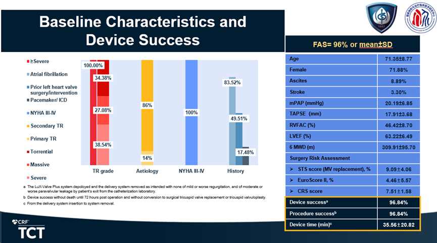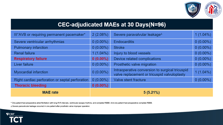 心肌梗死、卒中、使用ECMO或IABP、急性肝功能衰竭、長期機械通氣(>72小時)、需要外科干預的心血管損傷(心臟穿孔、血管損傷)、危及生命的大出血事件發(fā)生率均為0全因死亡率僅為1.08%(與器械無關) 急性腎臟衰竭、重度瓣周漏和中轉外科三尖瓣置換或成形術發(fā)生率均僅為1.08%新發(fā)Ⅲ度房室傳導阻滯需植入永久心臟起搏器發(fā)生率僅為2.16%
