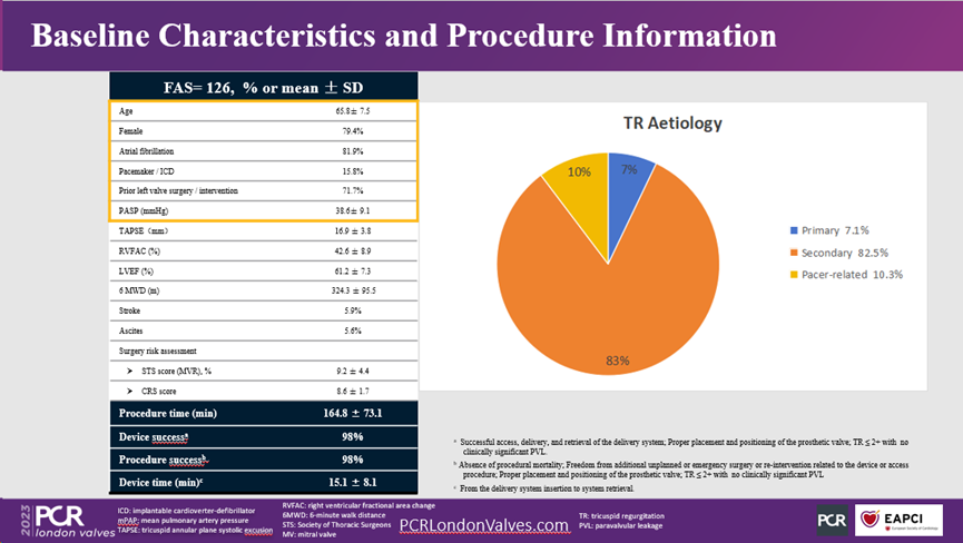 患者平均年齡65.8±7.5,79.4%為女性,81.9%患有房顫,15.8%有PM/ICD(起搏器/植入型心律轉(zhuǎn)復(fù)除顫器)植入史,71.7%有左心手術(shù)史,PASP(肺動(dòng)脈收縮壓)38.6±9.1mmHg。所有患者均為重度三尖瓣反流,其中7.1%為原發(fā)性三尖瓣反流,82.5%為繼發(fā)性三尖瓣反流,10.3%為起搏導(dǎo)線(xiàn)引起的三尖瓣反流。