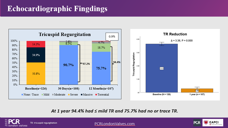 LuX-Valve經(jīng)導(dǎo)管三尖瓣置換系統(tǒng)可顯著降低三尖瓣反流,改善患者心功能和提高患者生活質(zhì)量。其中超聲數(shù)據(jù)顯示,99.1%的患者三尖瓣反流等級(jí)得到改善,94.4%的患者三尖瓣反流分級(jí)降低至輕度及以下,75.7%的患者恢復(fù)至無(wú)/微量三尖瓣反流。一年隨訪(fǎng)數(shù)據(jù)呈現(xiàn)了良好的安全性與有效性。
