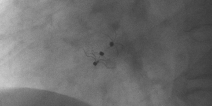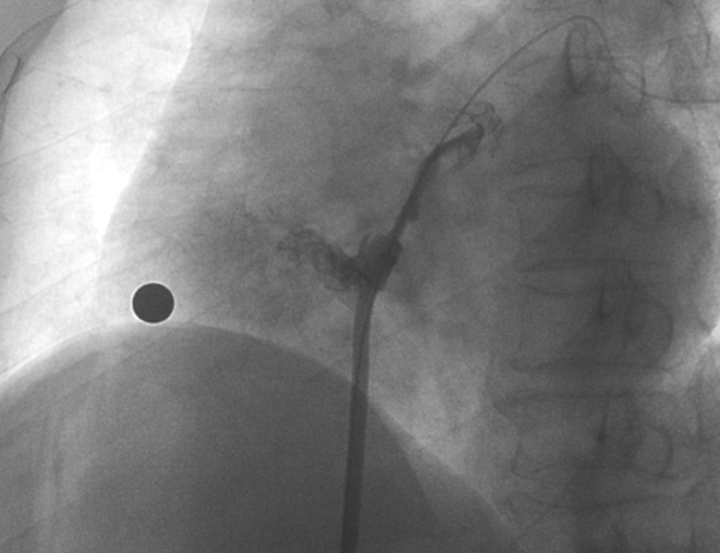 造影顯示PFO封堵完全,無殘余分流, 試驗器械充分舒展并貼合良好