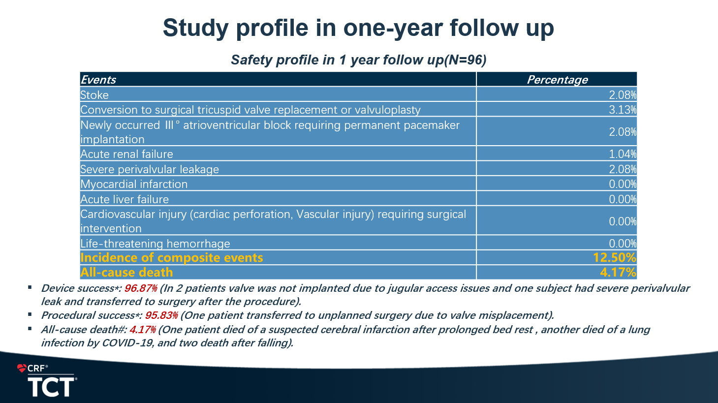 安全性結(jié)果顯示,復(fù)合事件發(fā)生率為12.50%。心梗、使用ECMO(體外膜肺氧合)或IABP(主動脈內(nèi)球囊反搏)、急性肝功能衰竭、長期機械通氣(>72小時)、需要外科干預(yù)的心血管損傷(心臟穿孔、血管損傷)、危及生命的大出血事件發(fā)生率均未發(fā)生。全因死亡率僅為4.17%,急性腎臟衰竭、重度瓣周漏和中轉(zhuǎn)外科三尖瓣置換或成形術(shù)發(fā)生率分別為1.04%、2.08%和3.13%。新發(fā)III度房室傳導(dǎo)阻滯需植入永久心臟起搏器的發(fā)生率僅2.08%。