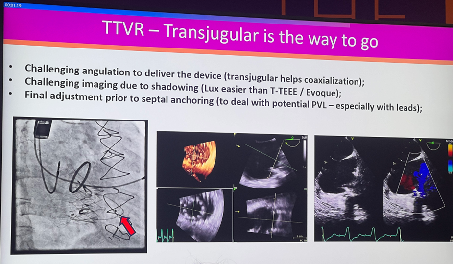 巴西圣保羅(Rede D'Or São Luiz, São Paulo, Brazil)的 Vinicius Esteves 教授結(jié)合了二例 LuX-Valve Plus 的植入案例探討了經(jīng)頸靜脈入路在TTVR中的優(yōu)勢(shì)。通過(guò)對(duì)比傳統(tǒng)經(jīng)股靜脈入路和經(jīng)頸靜脈入路,經(jīng)頸靜脈入路因?yàn)楦痰穆窂娇梢詼p少手術(shù)風(fēng)險(xiǎn)、縮短手術(shù)時(shí)間,并顯著降低術(shù)后并發(fā)癥;且更易對(duì)瓣膜的軸向性進(jìn)行調(diào)整,以降低瓣周漏的發(fā)生。同時(shí),由于經(jīng)頸靜脈入路并未產(chǎn)生更多的血管并發(fā)癥,越來(lái)越多的三尖瓣置換器械也在進(jìn)行經(jīng)頸靜脈入路的探索,展現(xiàn)了三尖瓣置換未來(lái)趨勢(shì)的一種可能性。LuX-Valve Plus作為頸靜脈入路TTVR器械的早期探索者,積累了非常豐富的臨床經(jīng)驗(yàn)。
