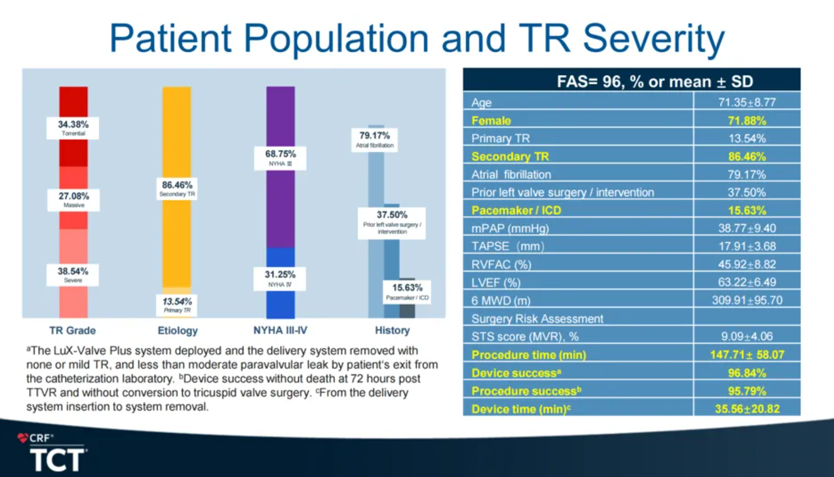 TRAVEL II研究主要用于評估LuX-Valve Plus在重度三尖瓣反流患者中應(yīng)用的長期安全性和有效性。TRAVEL II臨床試驗(yàn)共納入了中國15家臨床中心的96例患者?;颊咂骄挲g為71.35歲,平均STS評分為9.09%,37.50%的患者在研究前接受了左心瓣膜手術(shù),15.63%的患者存在起搏器植入史,同時多合并其他基礎(chǔ)病,基線情況較差,存在較高的外科手術(shù)風(fēng)險和接受其他介入治療方式的難度。