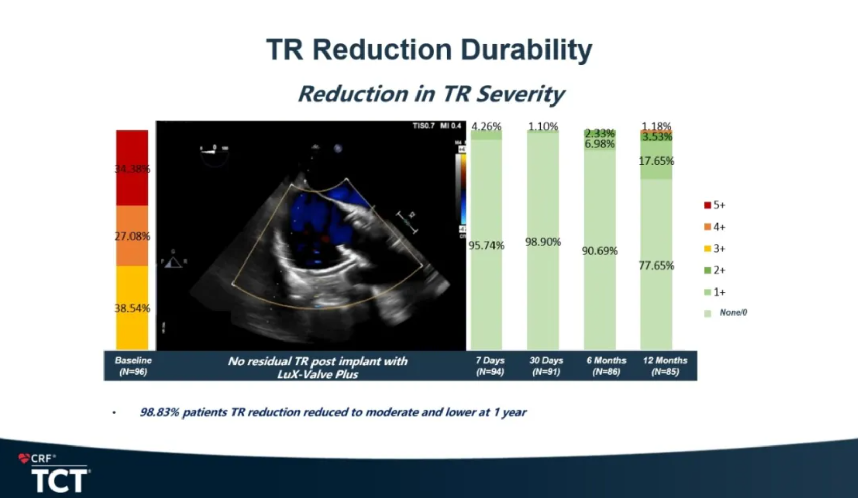 有效性結(jié)果顯示,患者的反流等級、心功能等級,以及生活質(zhì)量顯著改善。95.30%的患者在一年期時顯示無中度及以上反流。同時,根據(jù)超聲數(shù)據(jù)顯示,患者右心系統(tǒng)重構(gòu)也獲得受益。