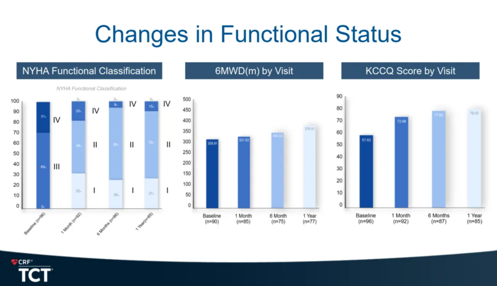 NYHA心功能改善方面,30天數(shù)據(jù)顯示約80%的患者由術(shù)前III/IV級提升至I/II級,一年期數(shù)據(jù)顯示約85%的患者由術(shù)前III/IV級提升至I/II級。在生活質(zhì)量方面,患者堪薩斯城心肌病變問卷(KCCQ)評分在30天平均提升15分,在一年期平均提升21分。有效性結(jié)果顯示患者的心功能和生活質(zhì)量持續(xù)改善。