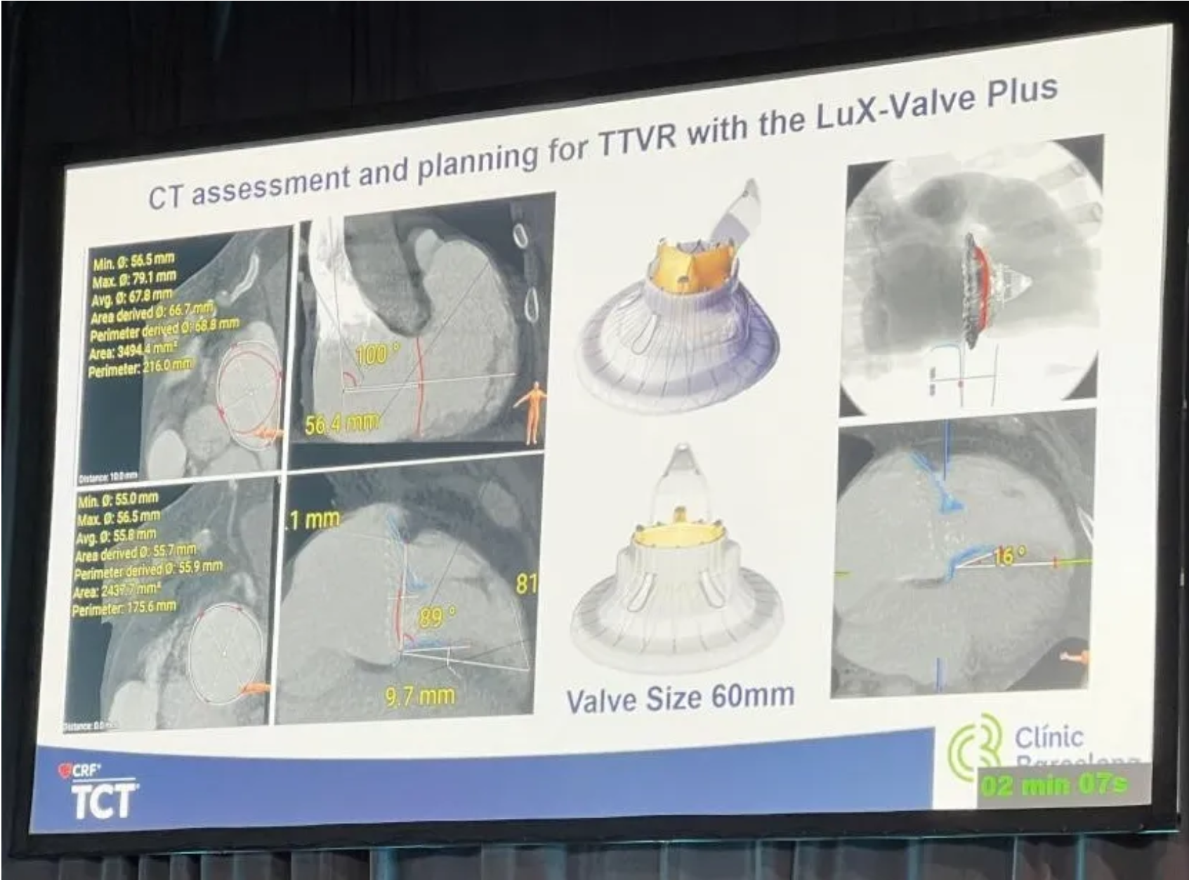 一位來自西班牙的術(shù)者在2024年美國經(jīng)導(dǎo)管心血管會議(TCT 2024)上進(jìn)行了一個病例報告的分享。一名 59 歲男性患者有肥胖、A型肝炎,永久性房顫等病史,同時患有三尖瓣心內(nèi)膜炎伴隨三尖瓣反流,右心衰,膿毒性肺栓塞,肺氣腫并需要長期待在ICU。根據(jù)巴塞羅那臨床中心醫(yī)院治療三尖瓣反流的流程,因?yàn)椴荒芙邮艿母唢L(fēng)險患者首先拒絕了開胸手術(shù)這個選項(xiàng);隨后在評估是選擇修復(fù)還是置換路徑的時候,由于患者瓣環(huán)擴(kuò)張嚴(yán)重而且中間有較大開口,因此在CT評估決定后,該中心選擇LuX-Valve Plus系統(tǒng)進(jìn)行三尖瓣置換術(shù)式。